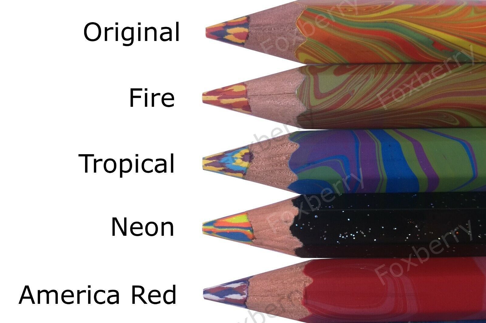 Swirled, multi-colour creates a constantly changing colour effect when drawing or writing (others in the market are made of split sections so colour doesn’t change easily). Extra thick, 6mm colour strip. High quality pigment and binders. Pencil is fully bonded for break resistance. Five different bright pencil colour strip combinations. Great on black or white paper. Amazing line drawings are created!