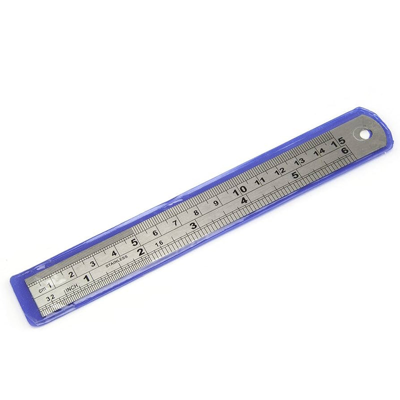 Precision made stainless steel rule, millimetres on one side and inches on the other side.